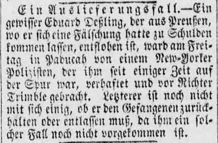 Ein Auslieferungsfall.- Ein gewisser Eduard Deßling, der aus Preußen, wo er sich eine Fälschung hatte zu Schulden kommen lassen, entflohen ist, ward am Freitag in Paducab von einem New-Yorker Polizisten, der ihm seit einiger Zeit auf den Fersen war, verhaftet und vor .......