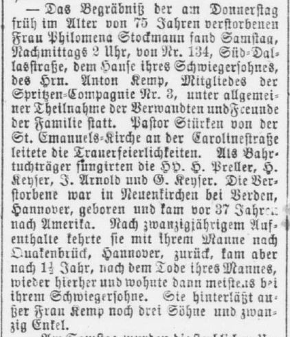Verstorben: Das Begräbnis der am Donnerstag früh im Alter von 75 Jahren verstorbenen Frau Philomena Stockmann fand Samstag, Nachmittags 2 Uhr, von Nr. 134, Süd-Dallas-Straße, dem hause ihres Schwiegersohnes, des Hrn. Anton Kemp, Mitglied der Spritzen-CompagnieNr. 3 unter allgemeiner Theilnahme der Verwandten und Freunde der Familie statt. Pastor Stüvken von der St. Emanuels-Kirche an der Carolinestraße leitete die Trauerfeierlichkeiten. Als bahrtuchträger fungirten die HH. H. Preller, H. Keyser, J. Arnold und G. Keyser. Die Verstorbene war in Neuenkirchen bei Verden, Hannover, geboren und kam vor 37 Jahren nach Amerika. Nachn zwanzigjährigem Aufenthalte kehrte sie mit ihrem Manne nach Quakenbrück, Hannover, zurück, kam aber nach 1 1/2 Jahre, nach dem Tod ihres mannes, wieder hierher und wohnte dann meistens bei ihrem Schwiegersohne. Sie hinterläßt außer Frau Kemp noch drei Söhne und zwanzig Enkel. Link |