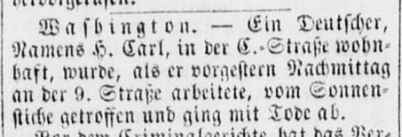 Washington.- Ein Deutscher, Namens H. Carl, in der C.-Straße wohnhaft, wurde, als er vorgestern Nachmittag an der 9. Straße arbeitete, vom Sonnenstiche getroffen und ging mit dem Tode ab.